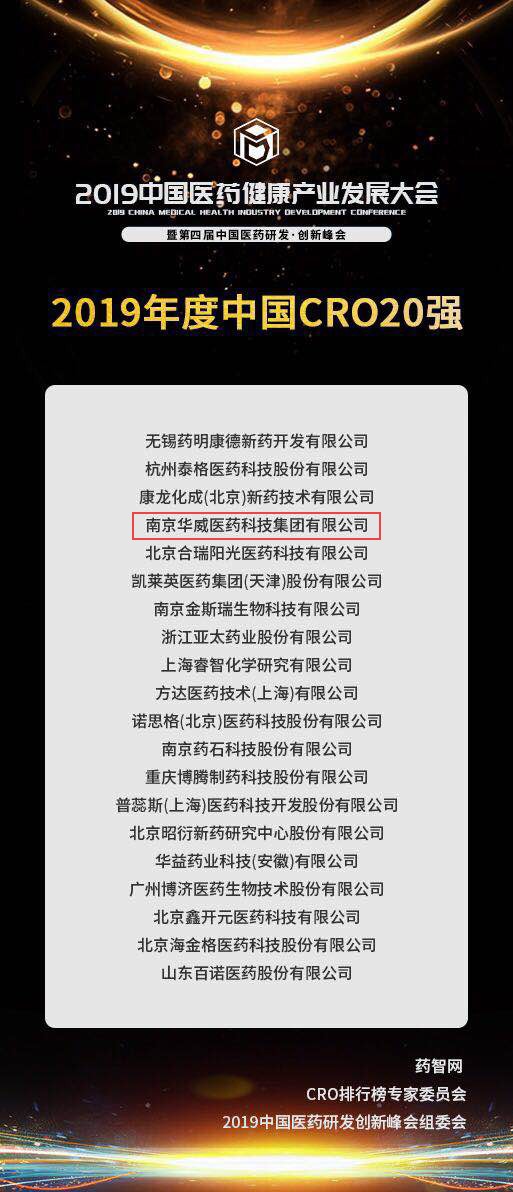 值得關注的是,2019年度中國CRO20強榜單是從企業的銷售額、利潤、研發投入、細分領域等多個維度綜合打分評選出的。此次華威醫藥再次入選榜單前20強實屬不易,這對華威而言是榮譽,更是我們砥礪前行的動力和壓力。未來,華威醫藥將始終向前,一如既往為合作伙伴提供專業的藥品研發服務和一體化的解決方案,為中國醫藥研發事業貢獻自己的力量。