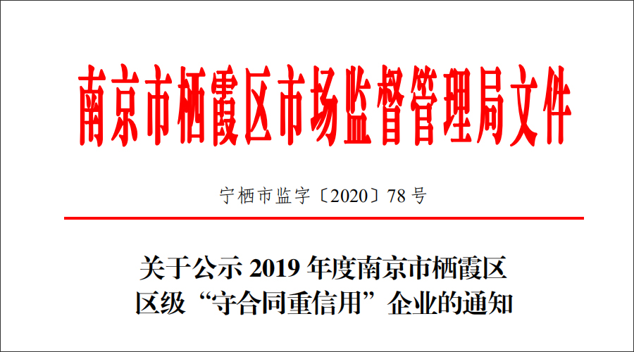 近日,為進一步推進企業誠信建設,規范企業合同行文,引導企業誠信履約、守法經營。根據《南京市市級守合同重信用企業公示辦法》 的相關規定,南京市棲霞區市場監督管理局特向社會公示,確定南京華威醫藥科技集團有限公司等101家企業入選 2019 年度南京市棲霞區區級“守合同重信用”企業。