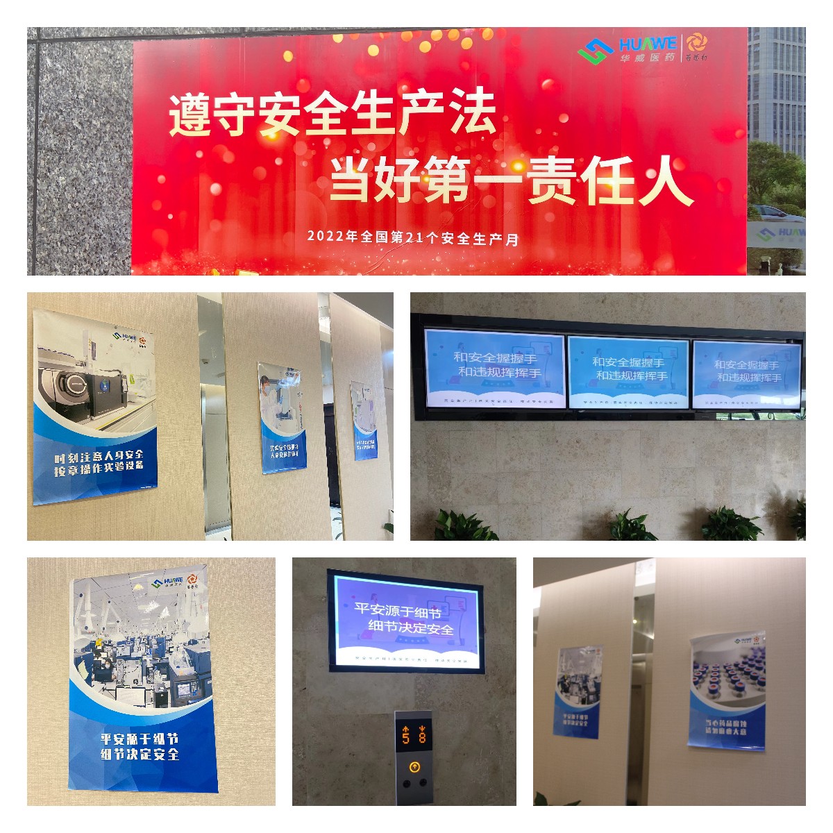 夯實安全生產責任,深化安全知識認知!華威醫藥安委會辦公室提前籌備、細致部署,通過對公司C3以及F2棟大樓各樓層張貼警示海報;為實驗室各類儀器設備、化學品倉庫等添加標識標語;在公司各電子大屏進行安全生產月主題輪播等一系列安全文化宣貫,動員大家積極參與、深刻認識,為全公司營造出了濃厚的安全氛圍。